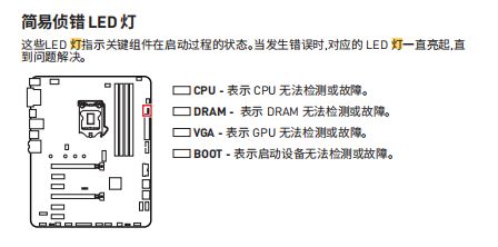 环顾主板,一抹红色格外显眼,上面赫然写着“EZ debug LED”,顾名思义,没想微星如此良心,真是省的人折腾,赶紧翻查各个红灯的含义,发觉红灯在DRAM与CPU间反复横跳,显然,问题仍就出在内存条身上,于是重新拔下内存条,用纸巾再次擦拭。再次尝试,DRAM与CPU已经翻篇,这下红灯指在了VGA处(回顾发现可能只是正在进行VGA自检,稍等会儿异常红灯应该也会熄灭),难道显卡也出了问题?总之,我们已经离开了DRAM与CPU的红灯阶段……