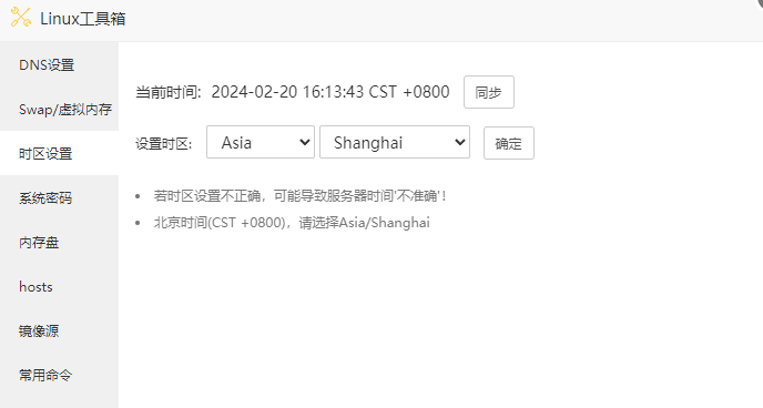 若为宝塔面板,可在面板--软件商店安装Linux工具箱,该工具箱具有配置DNS、Swap、时区、镜像源、hosts、系统密码、内存盘等功能。