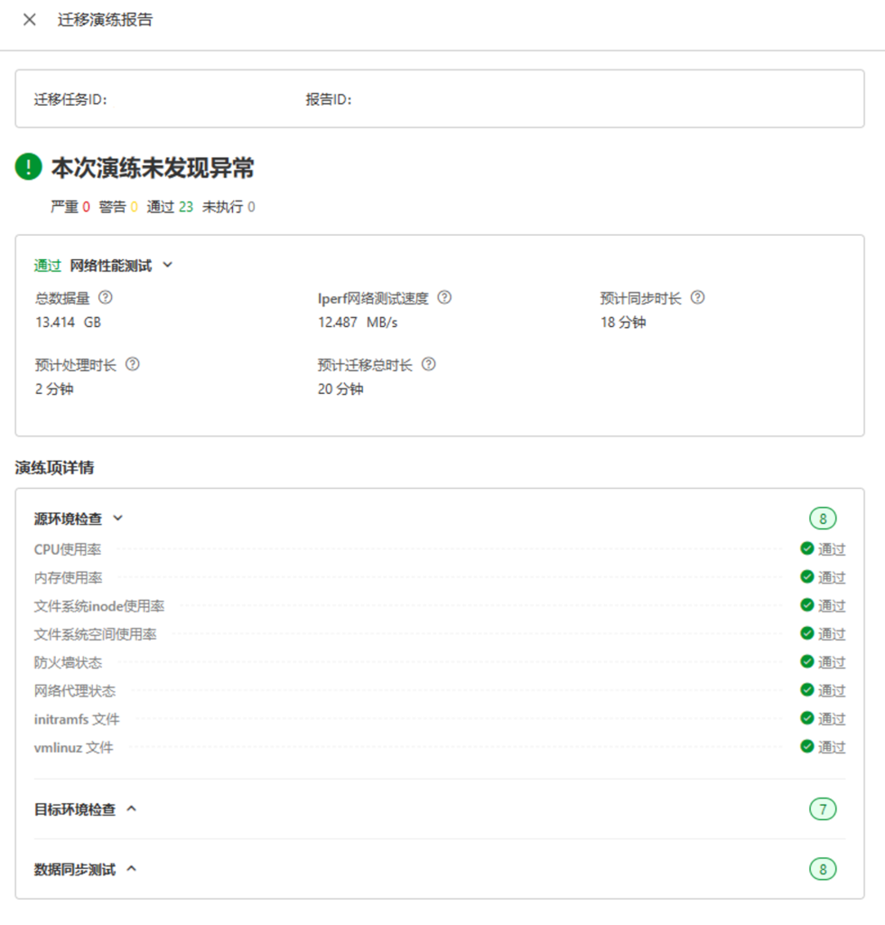 演练过程约为5分钟。得到演练报告如下图,可以了解到总数据量、网络速度、预估时长等信息。同时演练确保了源环境、目标环境、数据同步的健康。