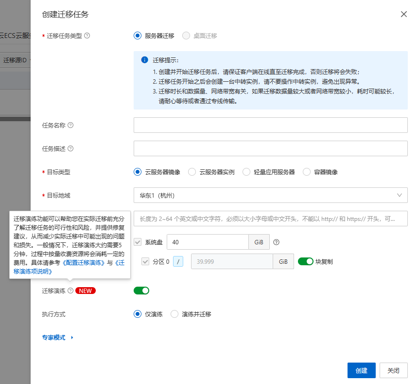 在创建迁移任务处,目标类型选择‘云服务器镜像’,开启迁移演练,执行方式选择‘仅演练’。
